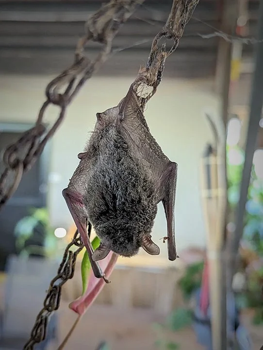 Tiny microbat hanging from the chain of my hanging pot plant.